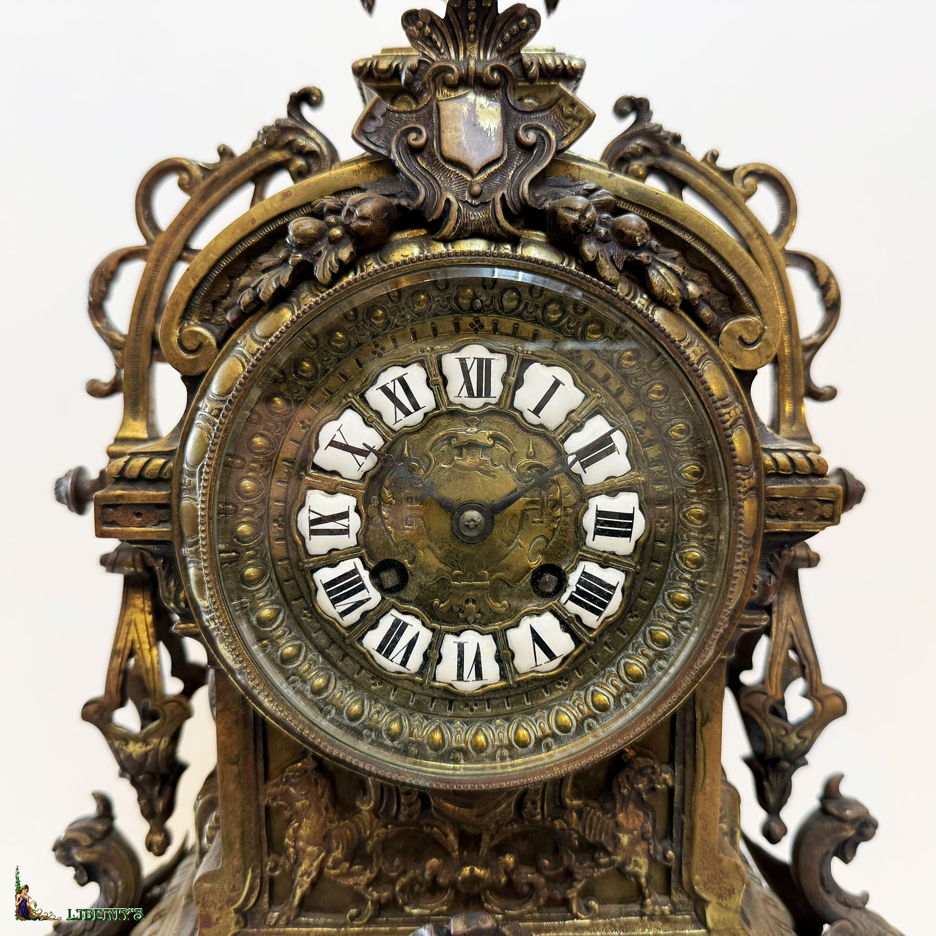 Bronze clock, cartouche with roman numerals, 21 in. height, with two candelabrums, 21-½ in. height